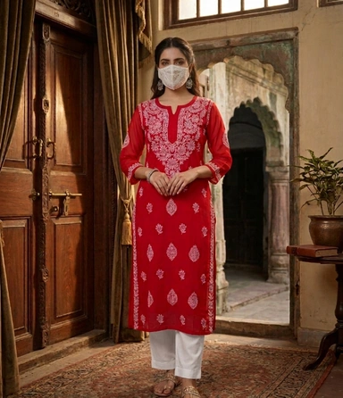 Bushra Chikankari Kurti Bootajal with Inner (Red) - Red, M-38
